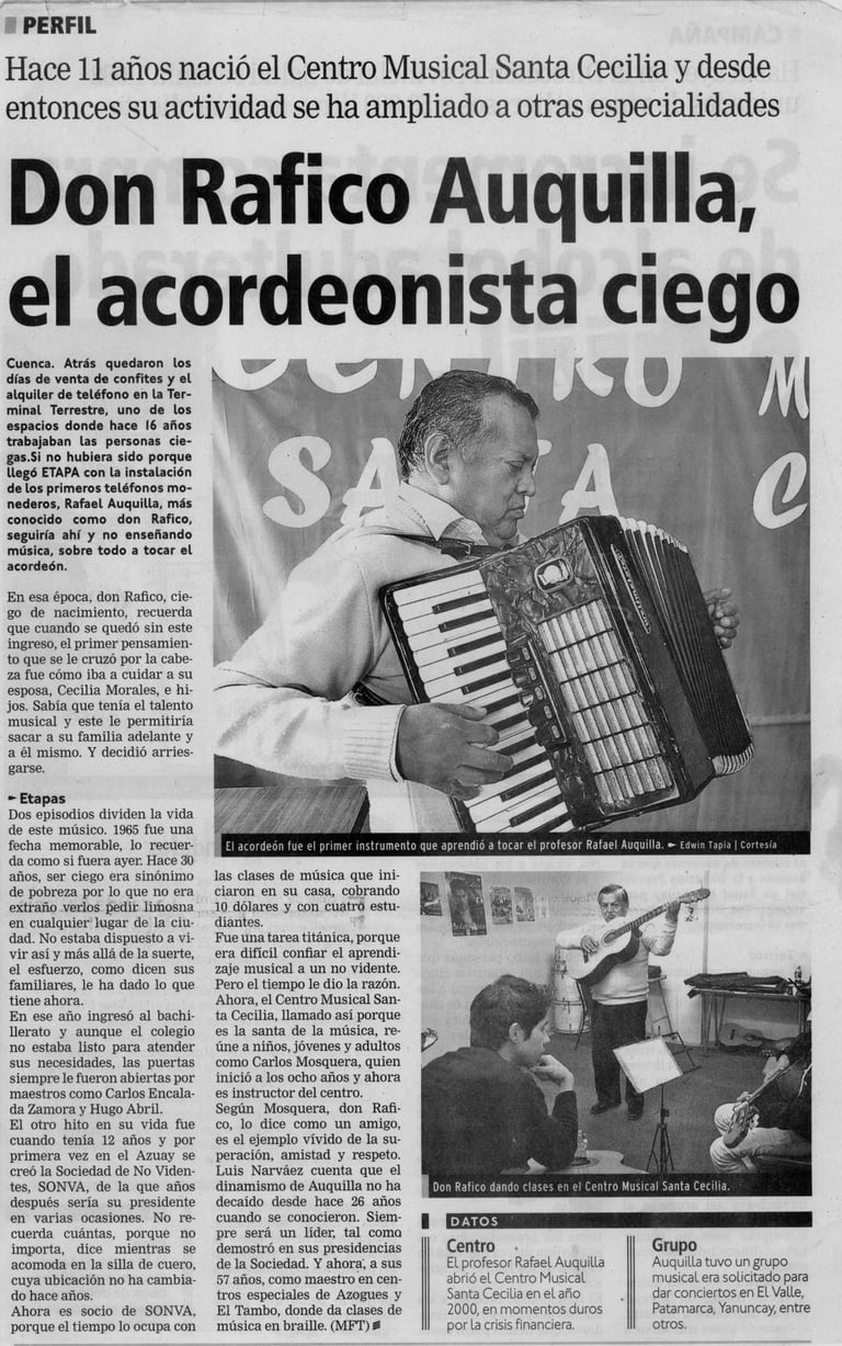 En el año 2005 al 2009, el Centro Musical “Santa Cecilia”, tuvo sucursales en los cantones Gualaceo y Sigsig. Desde entonces su enseñanza ha sido aceptada generación tras generación, por niños, jóvenes, adultos, adultos mayores y personas con discapacidad visual.