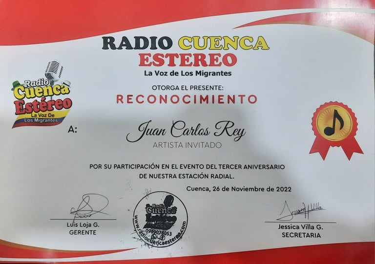 A lo largo de su carrera, Juan Carlos ha llevado su música más allá de las fronteras de Ecuador, compartiendo escenarios con algunos de los artistas más destacados de la región. Su compromiso con la música ha dejado una huella imborrable en la escena musical ecuatoriana, elevando el nombre de Cuenca y del país en cada presentación.